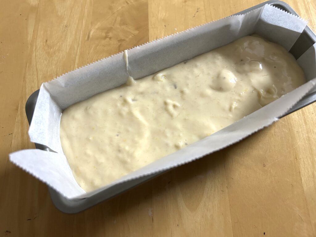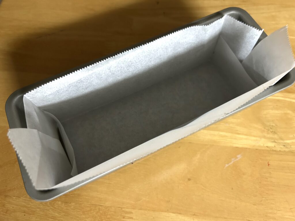 生地をクッキングペーパーを敷いたパウンドケーキ型(18cm)に流し入れます。