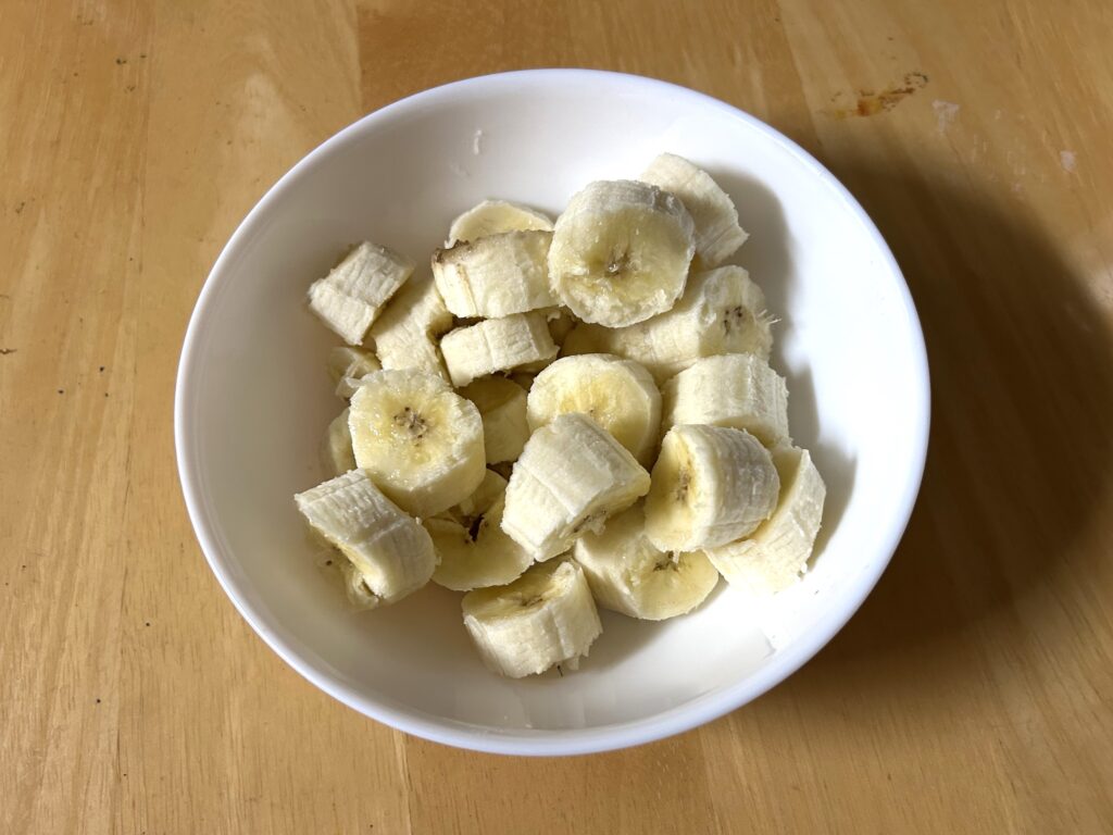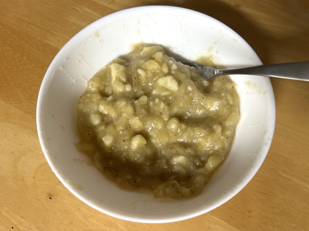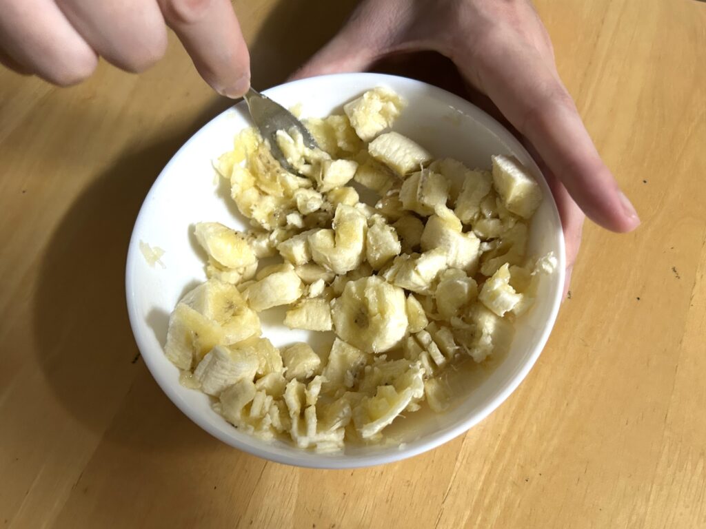 フォークを使ってバナナをしっかりと潰します。写真の分量はバナナ160gです。