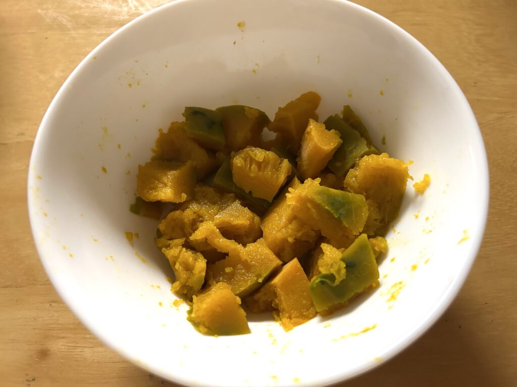 かぼちゃは皮を剥き1.5cm程の角切りにします。耐熱容器に入れ、小さじ1の水を上からかけてふんわりラップをし、電子レンジで柔らかくなるまで加熱します。(500w 3分~)