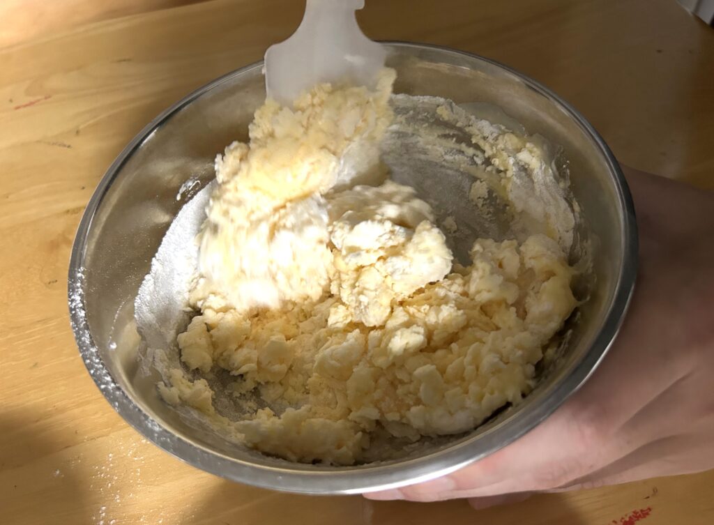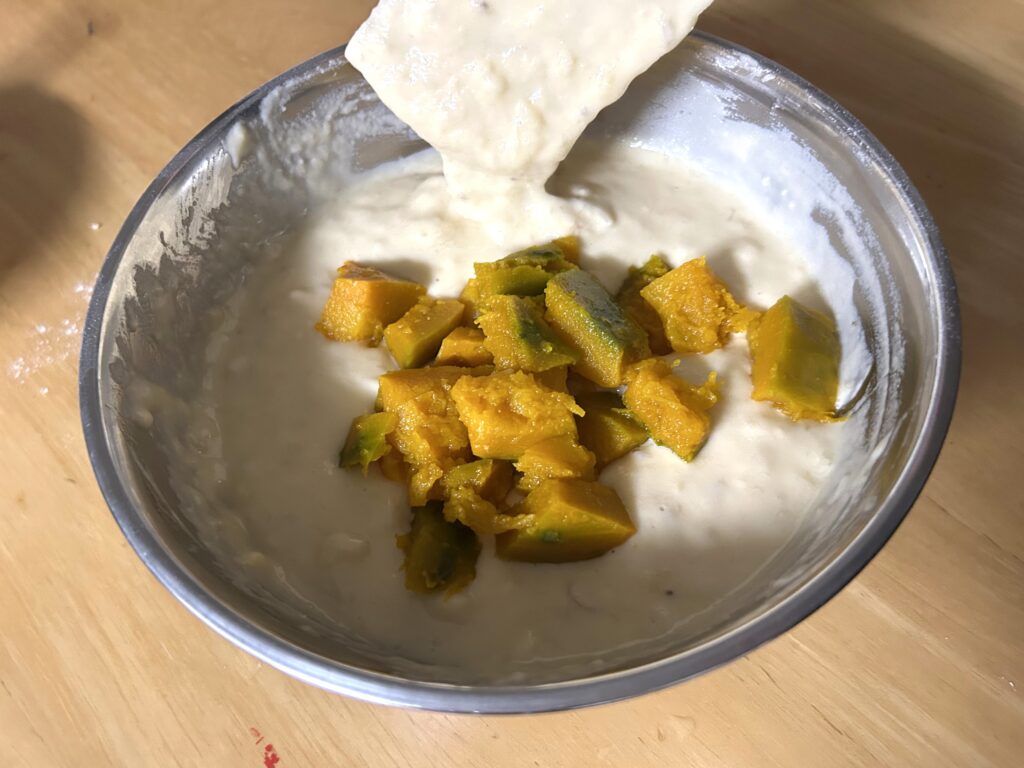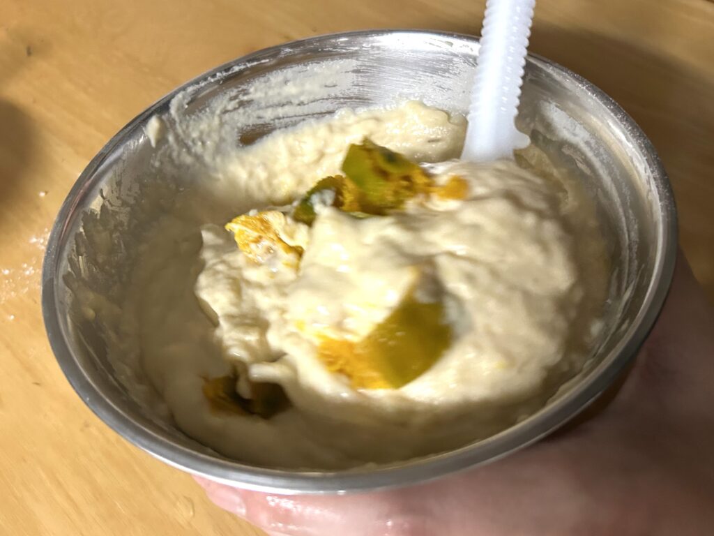 最後に、かぼちゃを入れてゴムベラで切るように混ぜます。かぼちゃは水分量の多いものだと形が崩れやすいので、サックリと混ぜます。