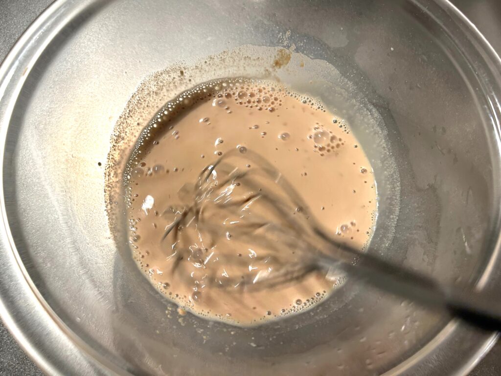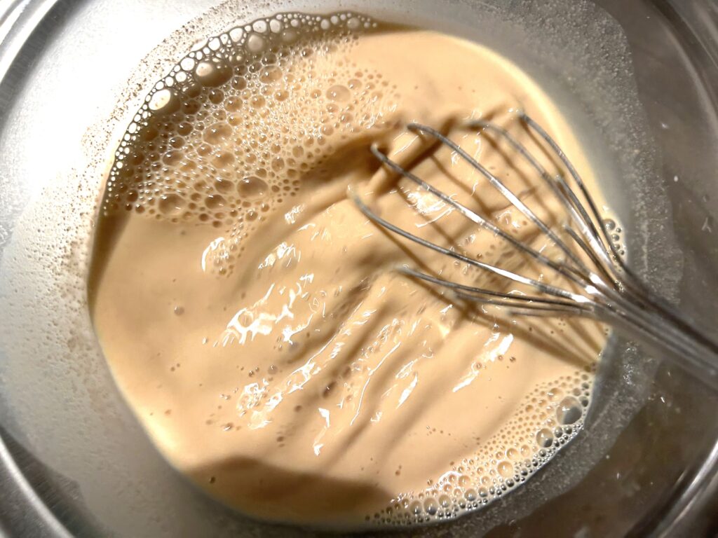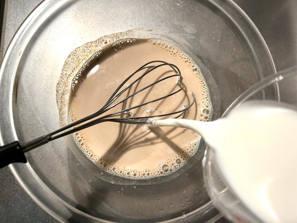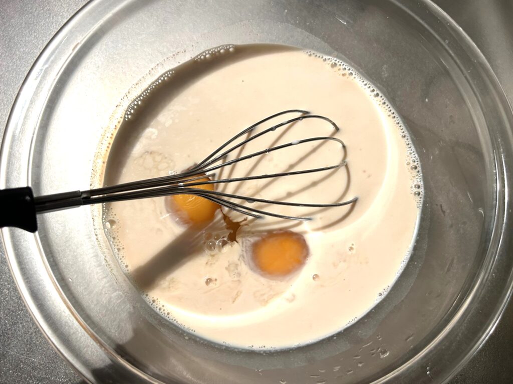 ボウルに残りの牛乳と卵を割り入れてよく混ぜます。泡立て器を使って卵の白身を切るよう混ぜましょう。