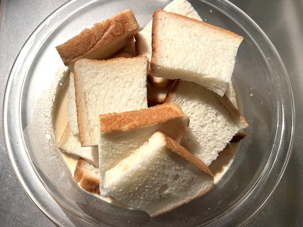 ③食パンを卵液に漬ける。