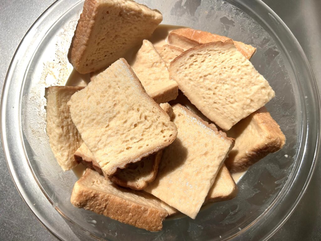 今回は1/4にカットしました。また卵液を作った耐熱ボウルに食パンを漬けます。やりやすいようにバットなどにうつしても構いません。