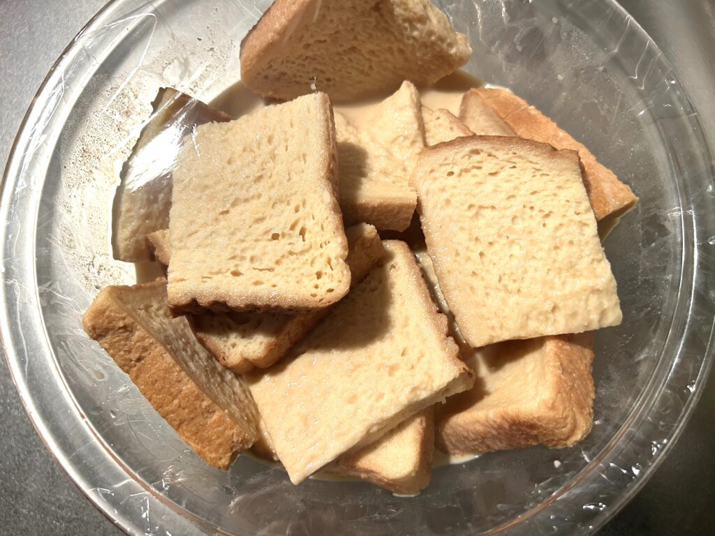 お好みの大きさにカットして、卵液に入れます。