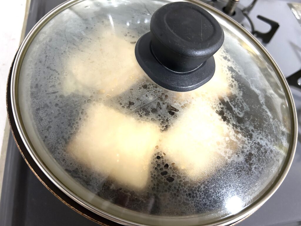 蓋をして、片面2分〜2分30秒程、ほんのりと焼き色がつくまで焼きます。きな粉は焦げやすいので、注意してください。